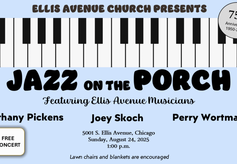 We have a special event following worship this Sunday August 24th.  As part of our yearlong 75th anniversary celebration we are having a jazz concert featuring some of our terrific EAC musicians Joey, Perry, and Bethany out on our recently rebuilt front porch.   We will gather for regular weekly worship at 11:00 am and then soon after worship concludes we will start the concert on the front porch.  A simple lunch will be provided (we will be eating outside).  The weather forecast looks terrific: dry conditions and a very comfortable 75 degree temperature.  There will be a few limited chairs and benches for the concert but folks are encouraged to bring a blanket or lawn chairs to stretch out in the yard as we enjoy the music.  There is some shade but you may also want to bring sunscreen and bug spray. Jazz on the Porch at Ellis Avenue Church